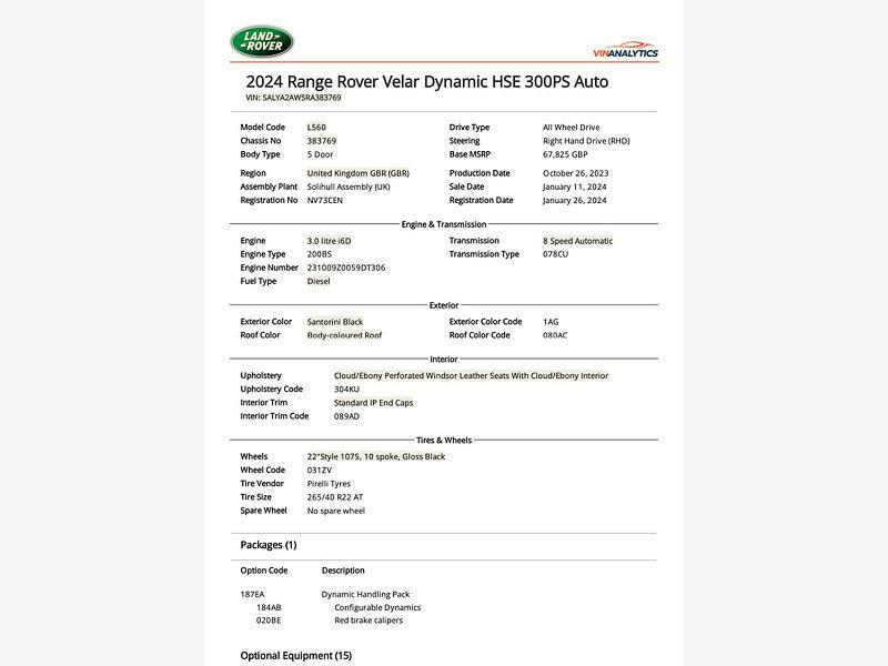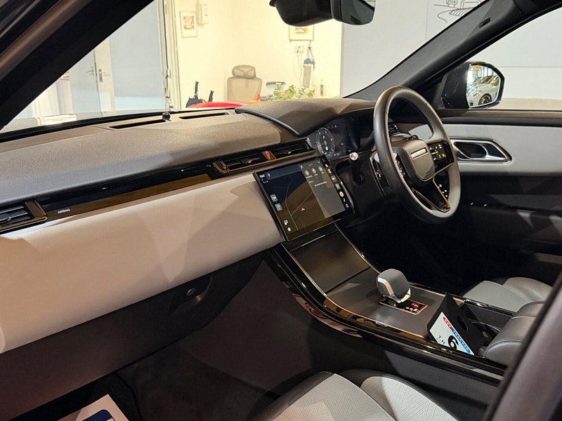 VAT QUALIFYING, This 2024 Range Rover Velar D300 Dynamic HSE is a superb example, having had only one owner since new. This impressive vehicle boasts a powerful 3.0 litre diesel engine paired with a Four Wheel Drive system, ensuring confident performance in all conditions. As a Euro 6 compliant model, it meets stringent emission standards. The Dynamic HSE trim level signifies a high specification, further enhanced by the inclusion of a Dynamic Handling Pack for an engaging driving experience. Comfort is paramount, with heated and cooled front seats and 20 way adjustable front seats featuring driver memory and rear power recline. The striking 22 inch Style 1075 alloy wheels in gloss black add to its sophisticated appearance. For convenience, it includes wireless device charging with a phone signal booster. Experience exhilarating performance with this Range Rover Velar, capable of accelerating from 0 to 60 miles per hour in just 6.1 seconds, a testament to its dynamic capabilities. This acceleration figure highlights its superior performance compared to many other vehicles in its class. The generous boot space offers ample room for luggage or shopping, making it a practical choice for families and adventurers alike. With a towing weight of 2500 kg, it is well equipped to handle trailers or caravans.